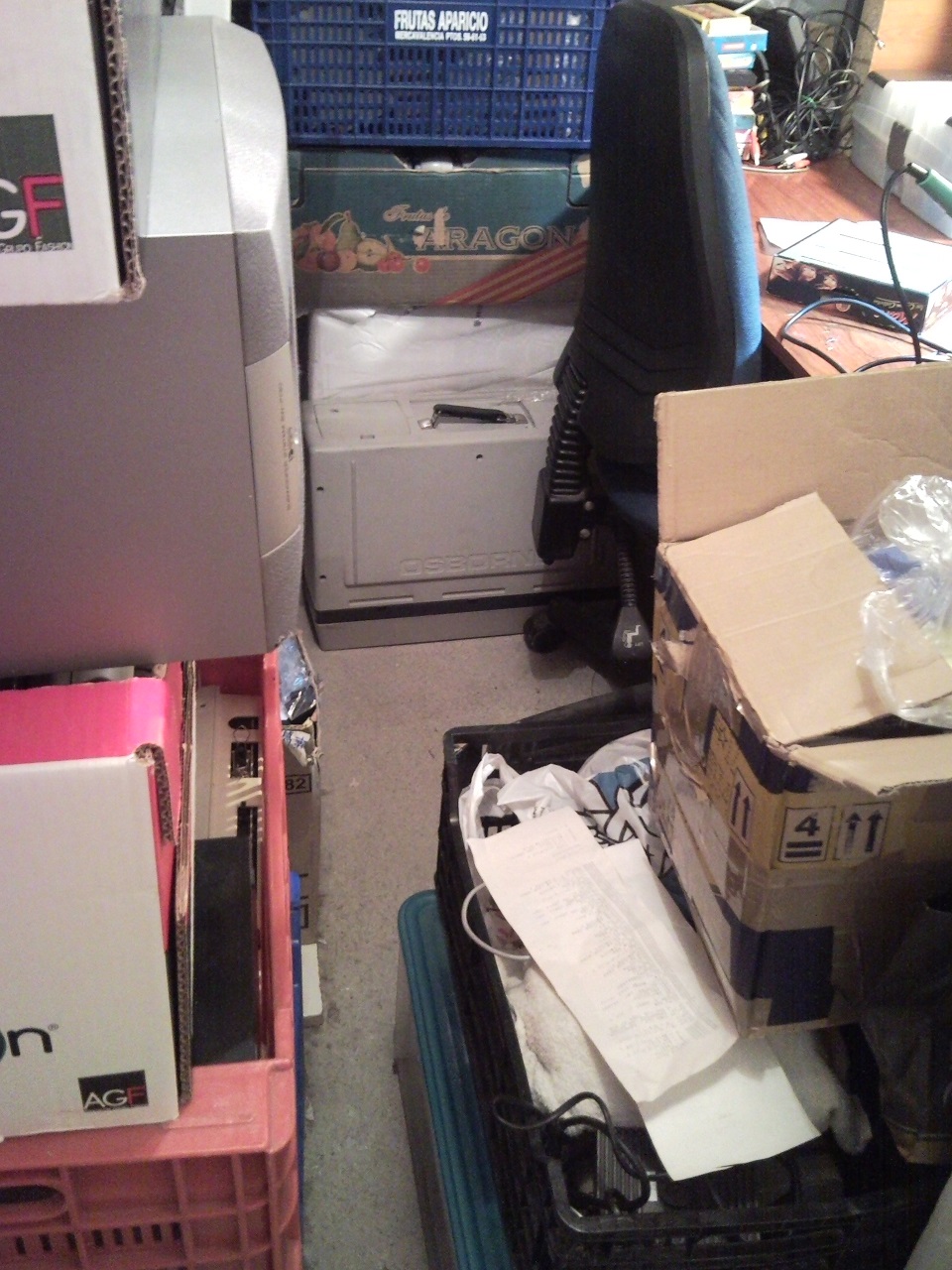 | Y como no cabe mas, hasta pegado a la puerta tengo cosas, para entrar o salir tengo que sacar las cajas o saltar por encima, un día de estos me daré una galleta, pero no tengo mas sitio, hago lo que puedo con el. El Osborne del fondo no es mio, tengo que devolverselo a su dueño un día de estos (por desgracia). |